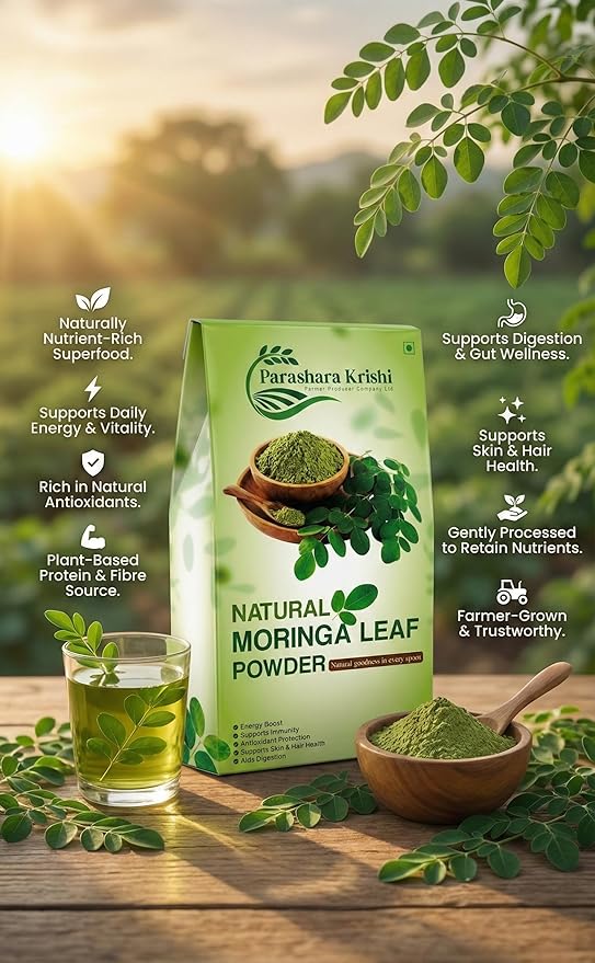 Pure Moringa Powder made from carefully shade-dried leaves. Naturally rich in vitamins, minerals, and antioxidants to support daily energy, immunity, and overall wellness.